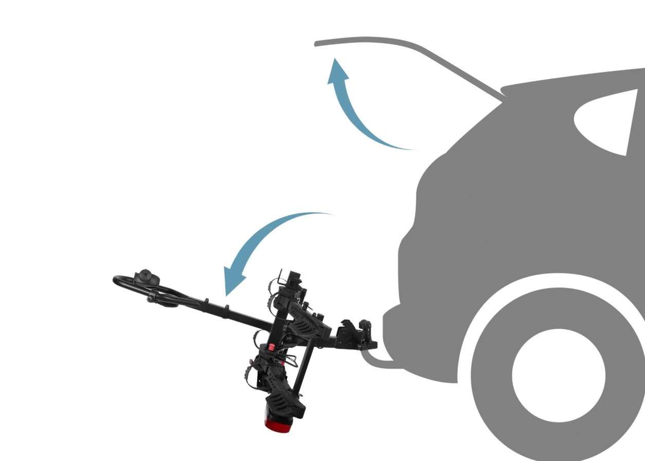 De Atlas SmartFold is zo ontworpen dat hij gekanteld kan worden, waardoor je toegang krijgt tot de achterklep zonder de fietsen eraf te halen.