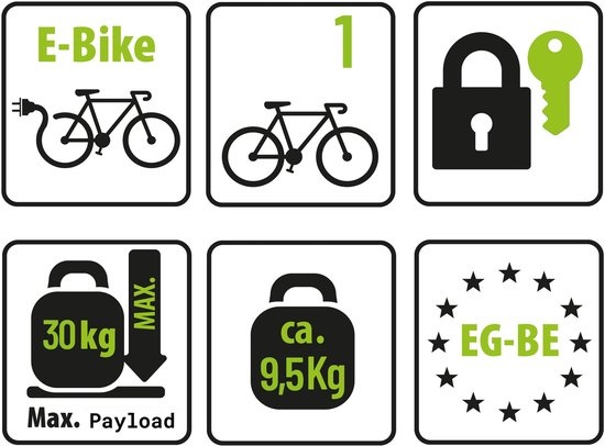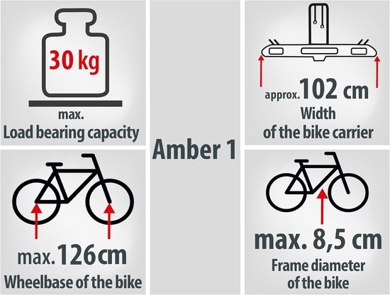 De Pro User Amber 1 is een unieke fietsendrager. De drager is namelijk geschikt voor 1 enkele fiets. Het draagvermogen is 30 kg en hierdoor kunt u dus, naast een (normale) stadsfiets ook een enkele elektrische fiets vervoeren. De Amber 1 is geschikt voor alle fietsframe maten, zowel ovaal als rond. Wel heeft de trekhaak fietsendrager beperkingen tot de maximale fietsmaten. Zo is de drager geschikt voor een maximale wielbasis van 1200 mm en maximale fietsband breedte van 60 mm. De Pro User Amber 1 is gemaakt van gecoat staal en heeft een eigen gewicht van 9,5 kg.