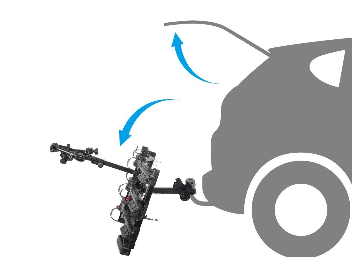 De Atlas Premium XFold is zo ontworpen dat hij gekanteld kan worden, waardoor je toegang krijgt tot de achterklep zonder de fietsen eraf te halen.
