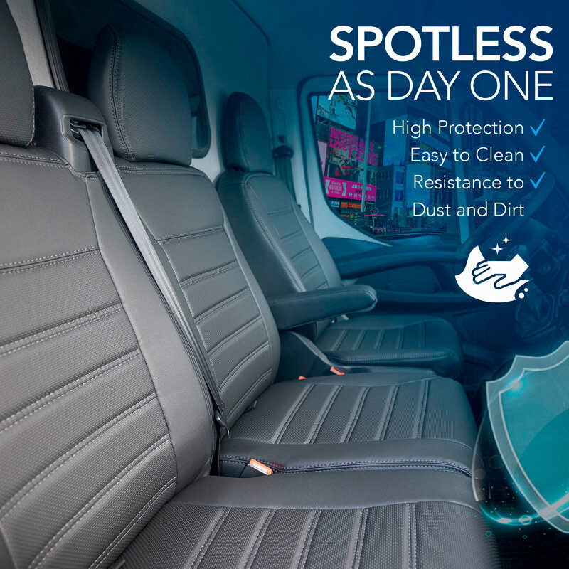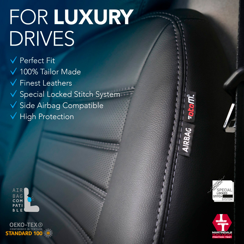 Hoge kwaliteit 100% pasvorm stoelhoezenset. Geavanceerde CNC productietechnieken garanderen een perfecte pasvorm en zorgen ervoor dat het auto-interieur er na plaatsing uitziet als de originele bekleding. De New York Design sets zijn gemaakt uit een combinatie van X-Type gestanst kunstleder (zitgedeeltes) en glad kunstleder (zijkanten/achterzijde) bekledingsstoffen in een zwarte kleurstelling, voorzien van grijze stiknaden. Door de speciale stiktechniek zijn de hoezen geschikt voor het normaal functioneren van de originele airbag. Naast de perfecte pasvorm bieden deze sets optimaal zitcomfort en een duurzame bescherming van uw originele bekleding tegen slijtage, verkleuring en/of vervuiling.
