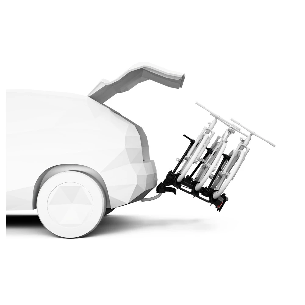 Kantelt omhoog richting de auto wanneer geparkeerd, waardoor het ideaal is voor stedelijk gebruik. Opmerking: de fietsendrager mag niet in opgerichte positie worden gereden; deze functie is alleen voor parkeren.